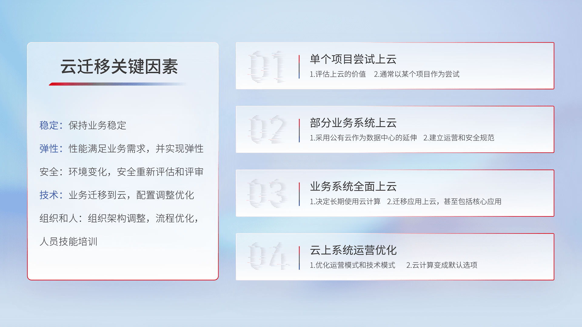 结合实际业务,,从规划设计、、、、云平台选型、、、云原生改造、、数据迁移、、、集成交付,,迁移全过程为客户识别最佳上云路径,,,做好风险识别管理,,,,设计网络架构、、、、身份权限、、、安全审计合规、、操作审计、、、日志审计、、、、监控告警策略、、多站点容灾设计等,,,,对云上基础设施进行整体规划,,,,提升IT治理水平,,,,以满足弹性、、、高可用、、、高性能的需求。。