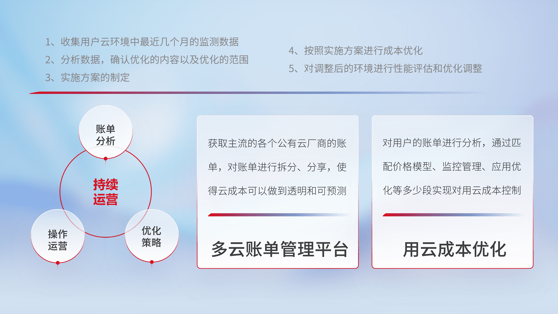 通过多云纳管,,,以统一的资源数据模型把客户的云资源进行抽象和封装,,进而实现对多云资源的统一操作,,,保障云资源管理的可靠性、、、稳定性与可用性。。。。量身定制化运维内容,,,,配置、、、开发运维、、、补丁管理、、、、备份、、监控、、、认证和访问管理、、、审计和日常巡检等,,保障在用云过程中的可靠度,,,,稳定度以及高可用率。。