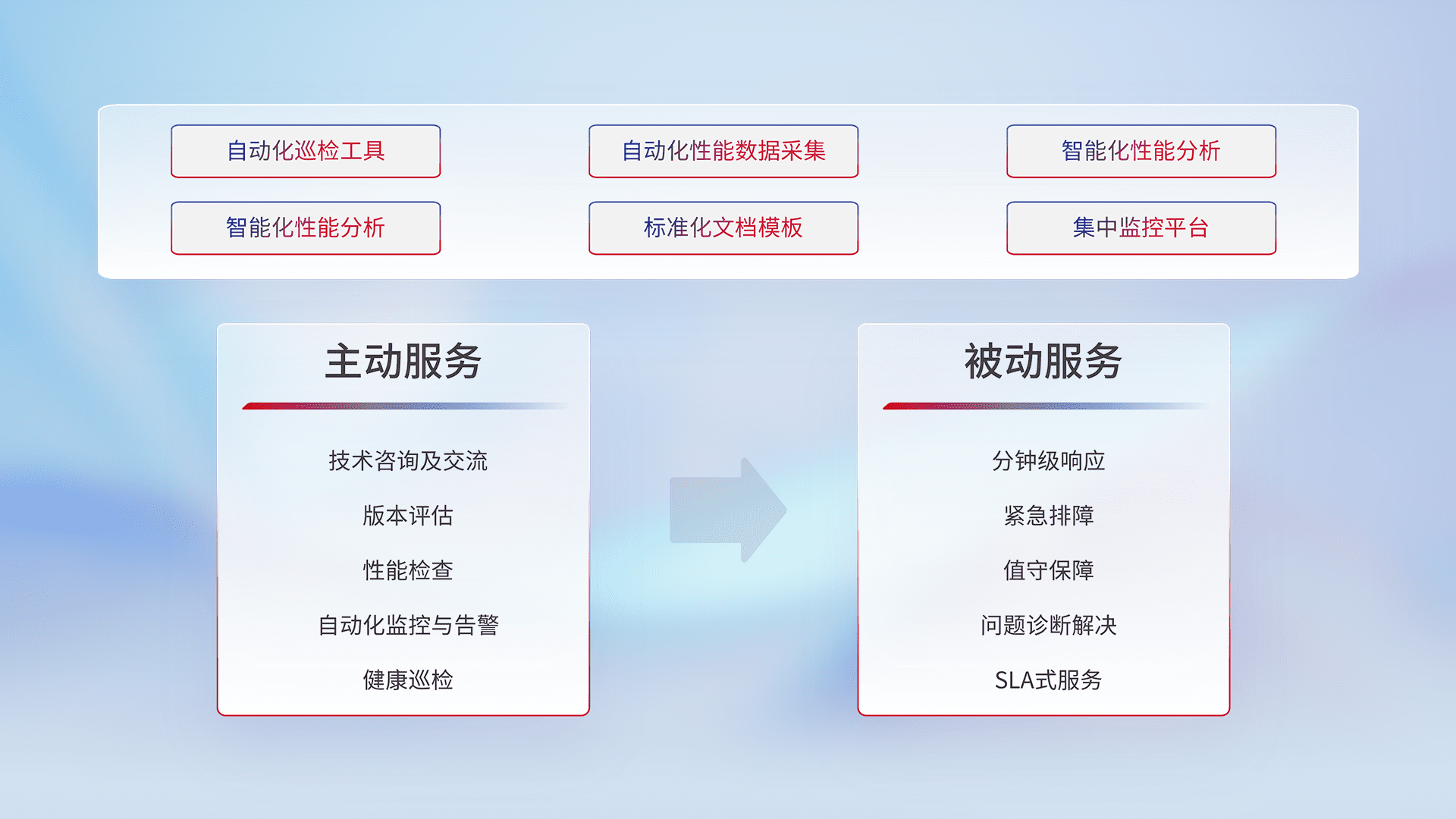智能化工具和标准化文档,,,保障服务质量,,提供主动服务(包含技术咨询、、版本评估、、、、性能检查、、自动化监控与告警、、、健康巡检)和被动服务包含(分钟级响应、、、紧急排障、、、值守保障、、问题诊断解决、、、SLA服务)。。。。